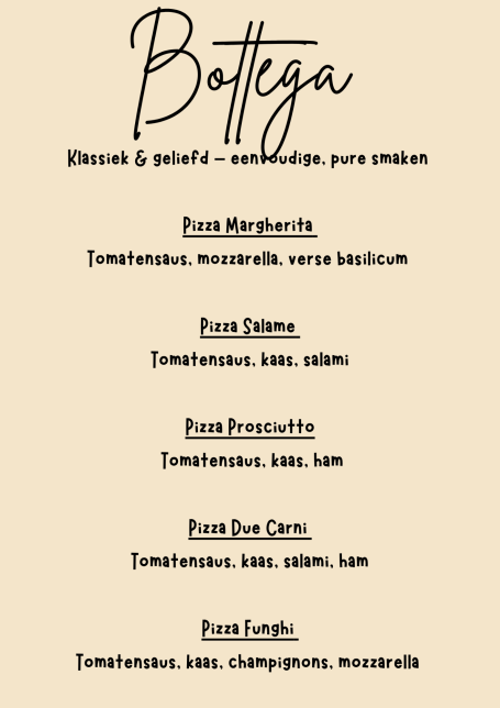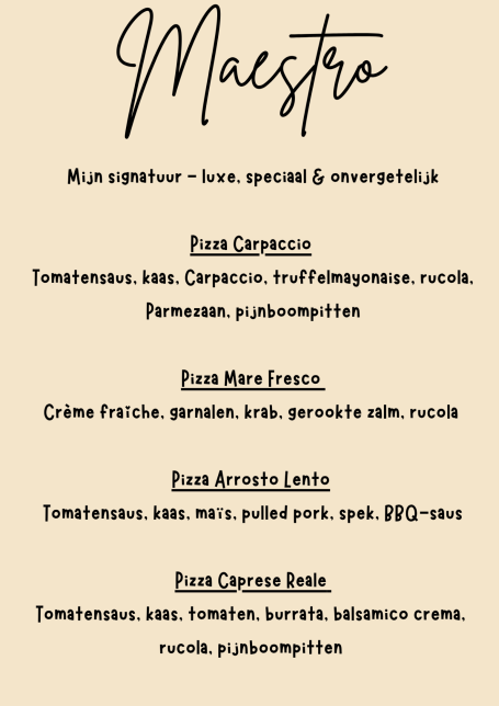 Of je nu kiest voor een klassieke Margherita of een verrassende Maestro-special: elke pizza wordt met zorg en liefde bereid, want voor mij is pizza meer dan eten... Het is beleving.